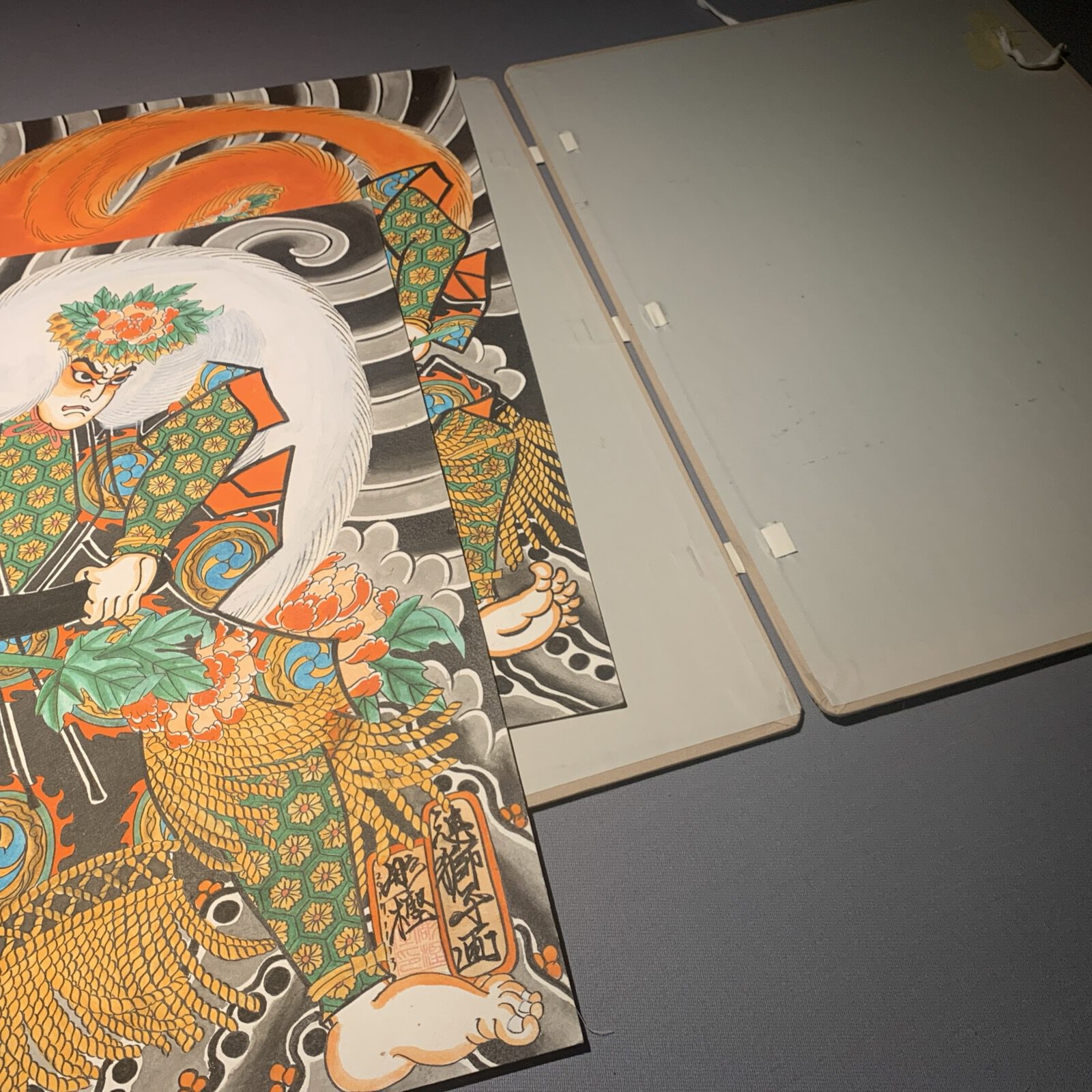 Two Paintings of Kabuki Actors on a gray table. The actors representing Lion dancers from Japanese theater are presented with beautiful garment Design wearing Wings made of Jak ox hair. One has a white wig and the other a red wig.